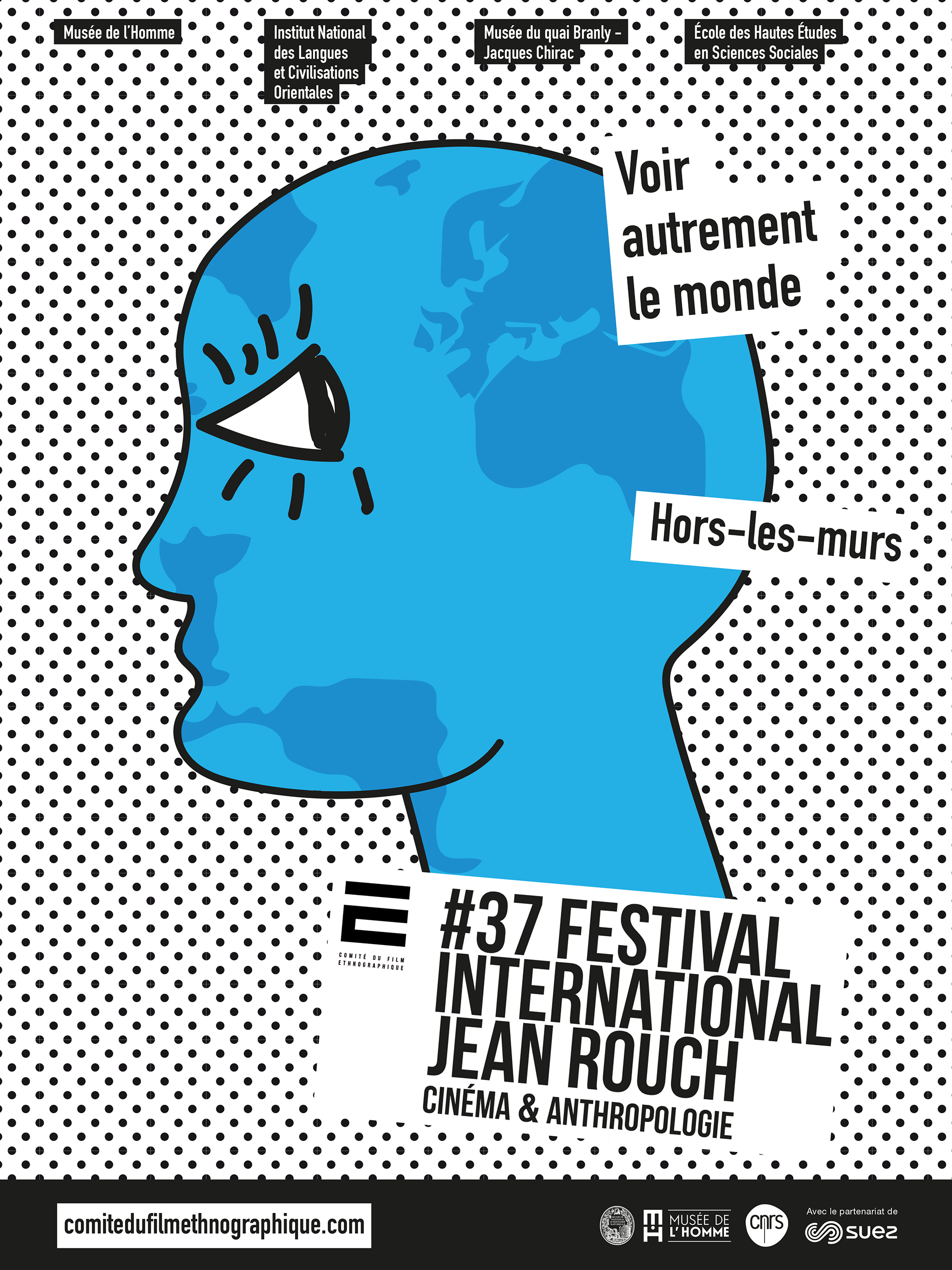 Affiche de promotion du trente-septième festival international Jean Rouch, présentant une sélection originale de films documentaires sur l’anthropologie et la sociologie. Un regard de l’homme sur lui même en somme. Visuel décliné sur kakémono et sur bannière web.