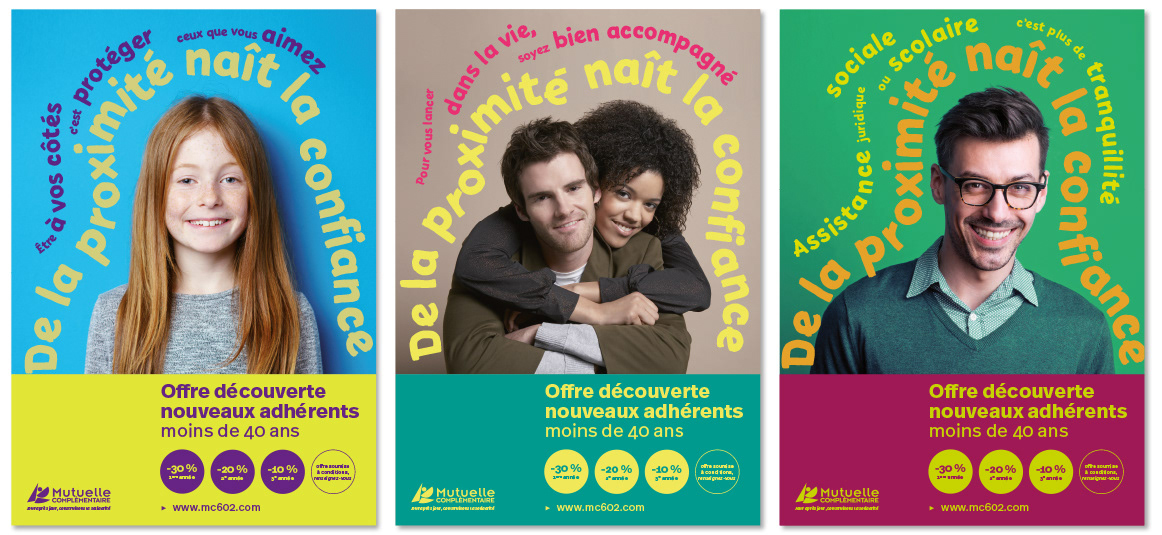 Campagne d’affiches promotionnelles pour la mutuelle complémentaire solidaire, sur le thème de la proximité.